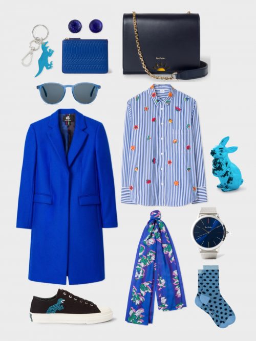 Clockwise from top-right: Paul Smith Women’s Navy ‘Sun’ Detail Leather Flap Handbag; Paul Smith Women’s White And Blue Striped Cotton Shirt With ‘Kyoto Floral’ Embroidery; Paul Smith Metallic Blue Ceramic Rabbit; Paul Smith Men’s Navy And Stainless Steel ‘Ma’ Watch; Paul Smith Women’s Light Blue Fluffy Polka Dot Socks; Paul Smith Women’s Indigo Stripe Floral Scarf; PS Paul Smith Women’s Black Canvas ‘Kinsey’ Trainers With Dino Print; PS Paul Smith Women’s Cobalt Blue Wool-Cashmere Epsom Coat; Paul Smith Blue ‘Mayall’ Sunglasses; Paul Smith Men’s ‘Dino’ Keyring; Paul Smith No.9 – Blue Leather Zip Pouch; Rachel Entwistle for Paul Smith Silver Stud Earrings With Blue Lapis Lazuli Stone.