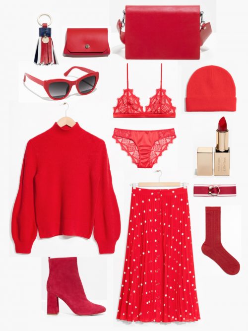 Clockwise from top-left: & Other Stories Leather Tassel Tricolour Keyring; & Other Stories Leather Mini Wallet; & Other Stories Wide Strap Crossover Bag; & Other Stories Lace Soft Bra; & Other Stories Satin Briefs; & Other Stories Wool Beanie; & Other Stories Lipstick in Cherry Ideal; & Other Stories Ribbon Choker; & Other Stories Metallic Ankle Socks; & Other Stories Red Dot Print Pleated Skirt; & Other Stories Sculpted Heel Suede Boots; & Other Stories Puffy Sleeve Sweater; & Other Stories Cat Eye Sunglasses.